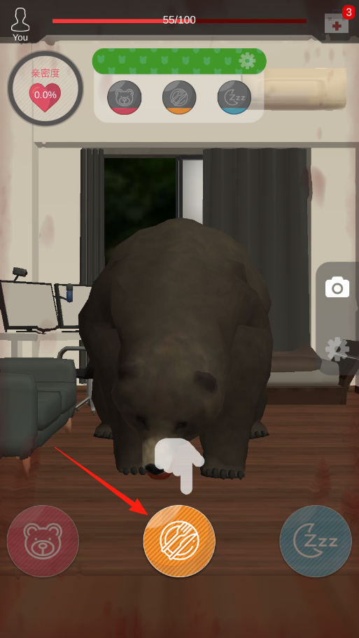 2、熊进入后,点击下方橙色食物按钮(箭头指向),投喂食物,提升亲密度(当前0.0%),恢复自身血量(从55/100到86/100)。