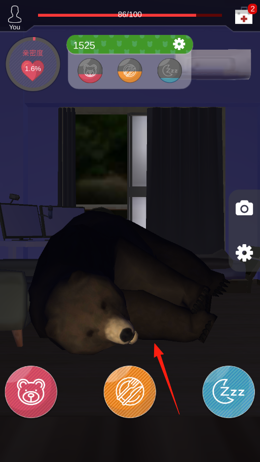 3、投喂后,熊进入睡眠状态(箭头指向),可点击蓝色睡眠按钮,维持互动,持续提升亲密度与生存状态。