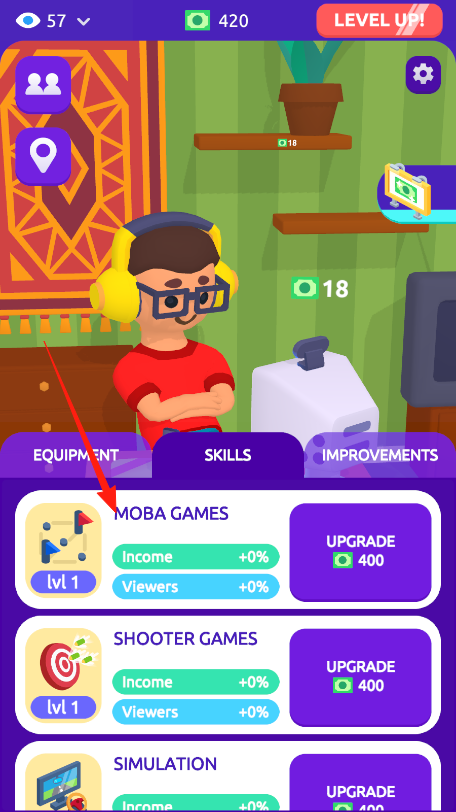 2、切换到“SKILLS”界面,选“MOBAGAMES”(箭头指向),花400货币升级,增加收入与观众。