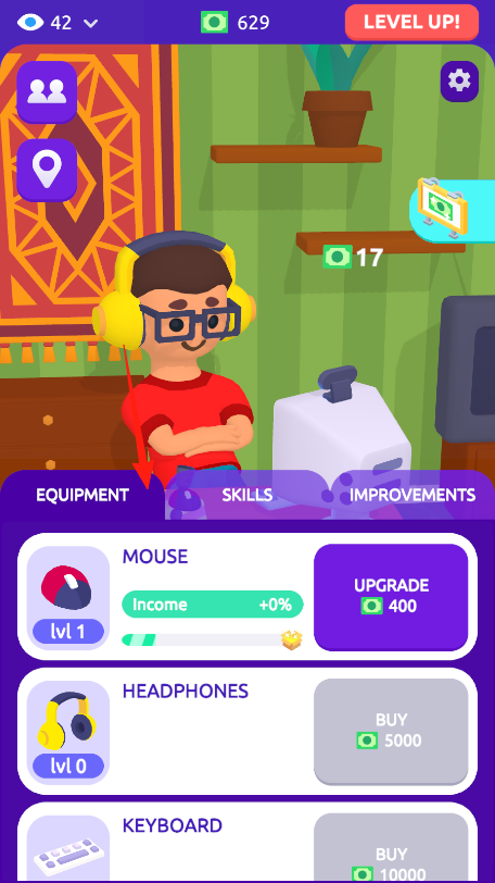 1、在“EQUIPMENT”界面,选“MOUSE”(箭头指向),花费400货币升级,提升收益。