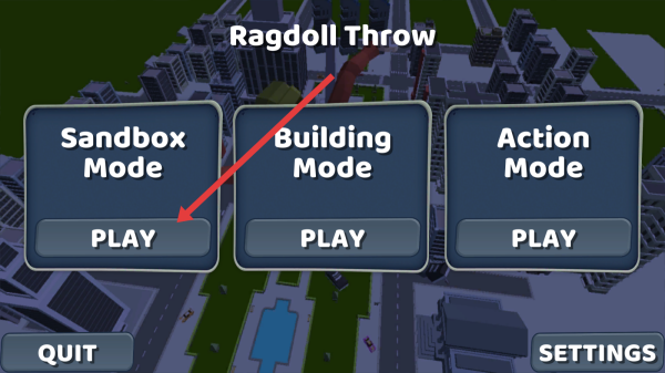 2、模式选择页点击“Sandbox-Mode”的【PLAY】,进入沙盒模式,可自由探索、实验,体验布娃娃投掷玩法。