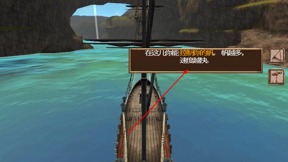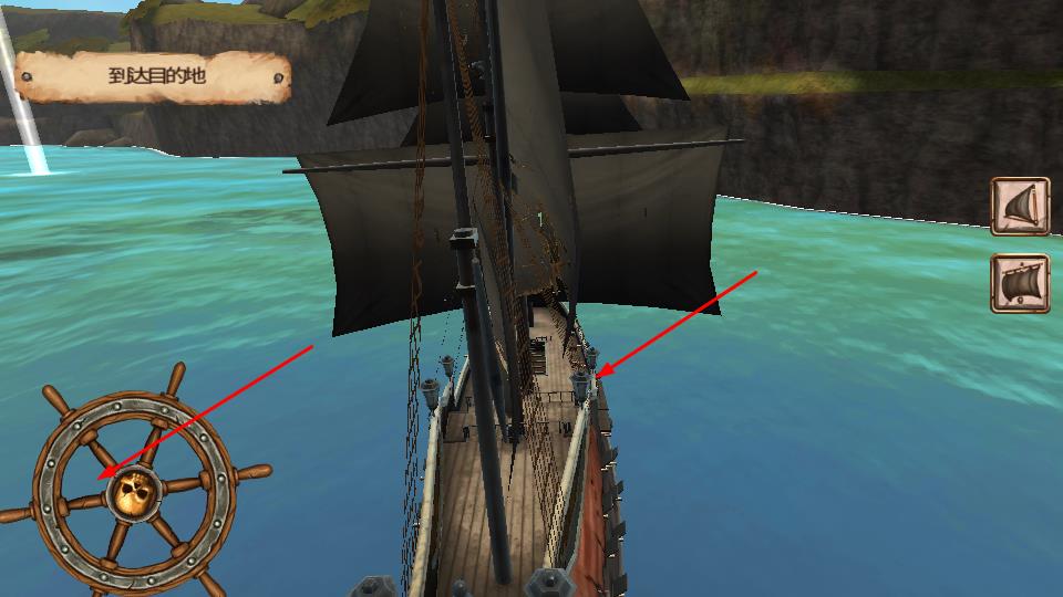 3、依据指引驾驶帆船穿越地形,利用帆提升速度、船舵转向,成功“到达目的地”,推进海盗冒险剧情。