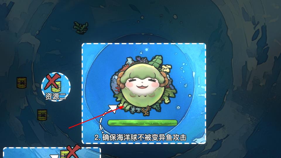 2、进入海洋关卡,目标保护“海洋球”不被变异鱼攻击,清除周围标有“X”的污染资源(如油桶)。