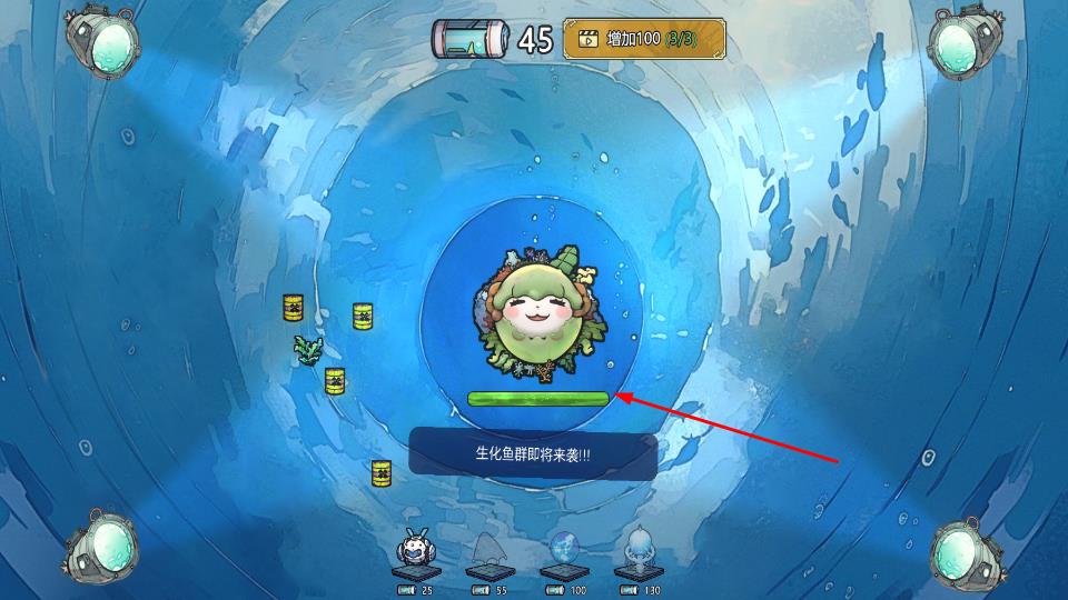3、关注上方能源与生化鱼群提示,利用下方单位(如不同技能角色)布置防御,抵御攻击,守护海洋球存活。