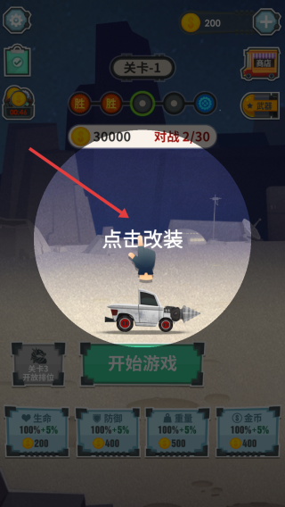 1、在游戏初始界面,确认关卡为【关卡-1】,可先点击改装强化车辆,再点【开始游戏】进入对战。