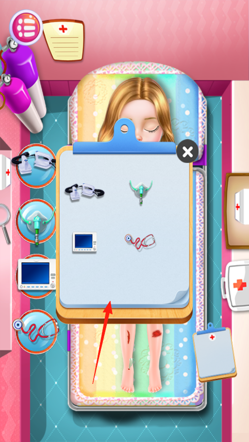 2、点击右侧病历板(箭头指向),查看所需医疗工具清单(如夹板、呼吸器等),准备对应器械。