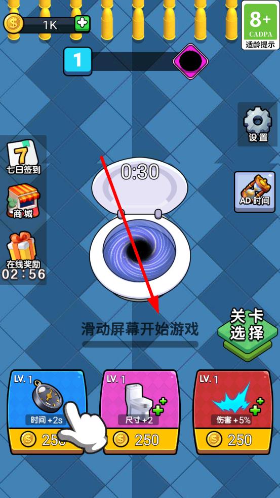 1、玩家点击“滑动屏幕”即可开启游戏,可在开启游戏前对于黑洞进行技能升级或尺寸、伤害进行升级,为之后的游玩打下基础。