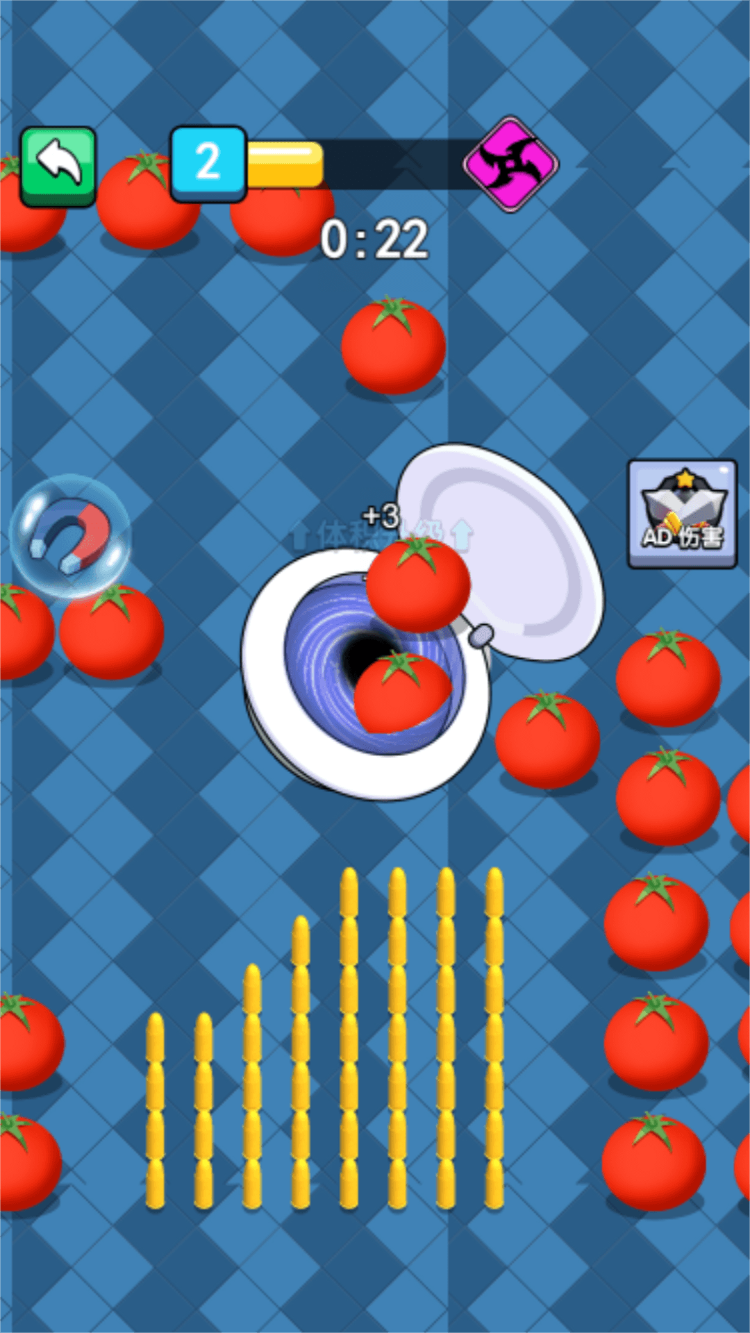 2、左右滑动屏幕,控制黑洞吞噬场上剩余物品,将其吞噬到体内,不停吞噬积累强劲战力,为面对强大敌人做好准备。