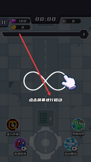 1、进入游戏后,依据游戏画面提示【点击屏幕进行移动】,通过手指触控的操作,控制角色的走位,开启战斗的过程。