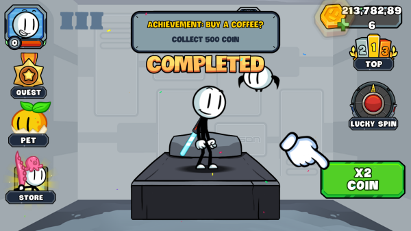2、玩家手持光剑站在台上,点击【COIN】界面等功能区,玩家完成收集500硬币成就后的奖励界面。