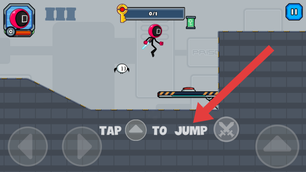 3、点击【TAPTOJUMP】操作提示、移动及攻击按钮,场景中的道具、陷阱等,需操控跳跃等动作闯关的玩法画面。