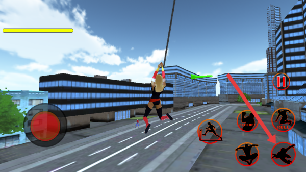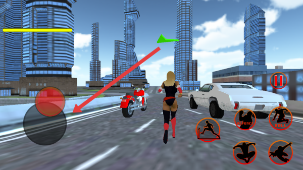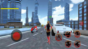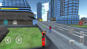 2、通过左侧虚拟摇杆移动角色(穿黑红战衣),在城市场景(道路、建筑)奔跑,点击右侧技能按钮(如攻击),应对障碍与敌人。