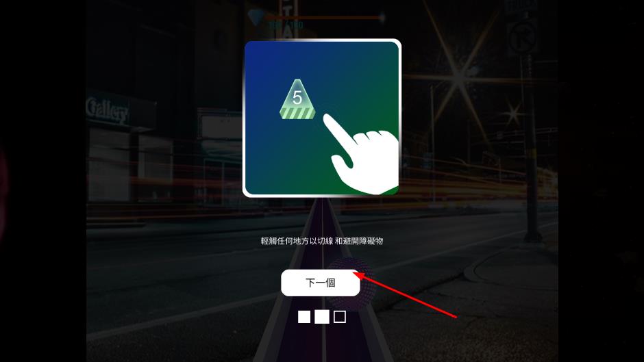 1、从教学关卡开始,跟随简单的音乐节奏学习小球的基本操作,掌握技巧,熟悉障碍物的出现规律,完成新手引导。