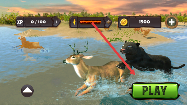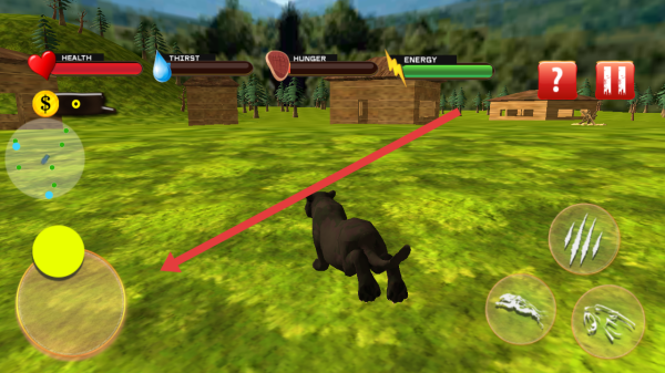 2、选择“1号关卡”,进入开放世界,操控黑豹在草原、水域场景活动,关注健康、饥渴等生存指标,捕猎鹿等动物。
