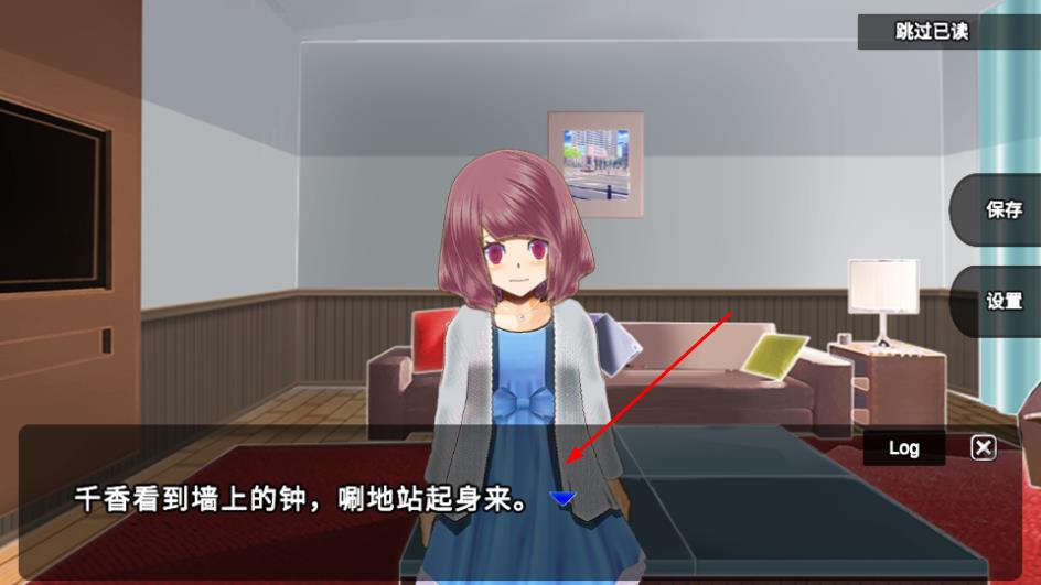 3、切换至室内场景,关注角色(如千香)行动与对话,点击继续按钮,推动情节发展。