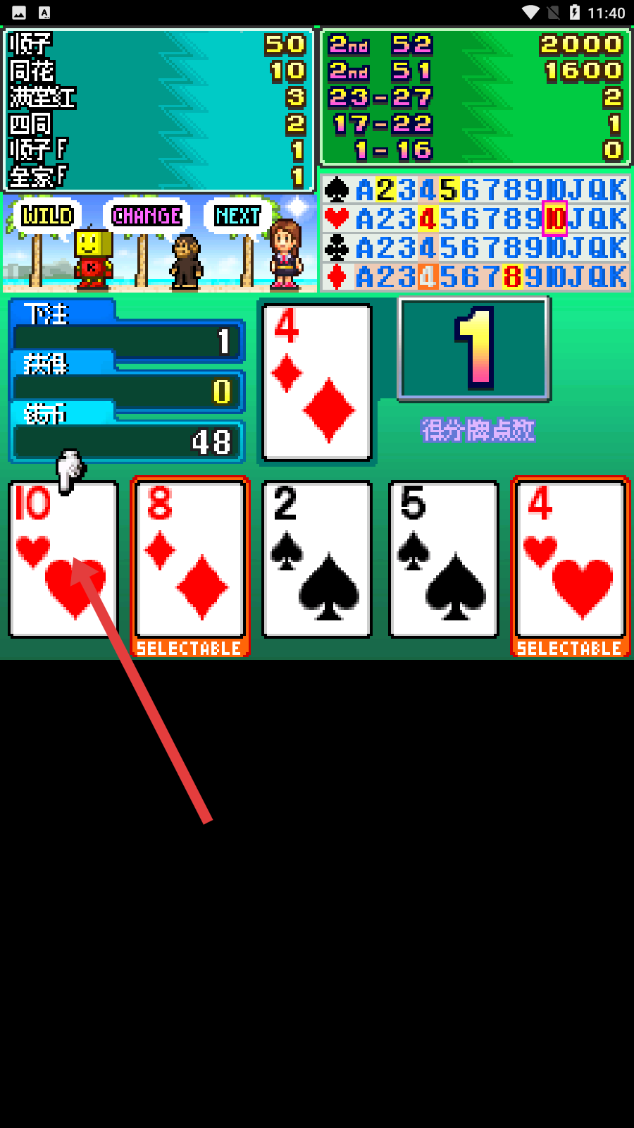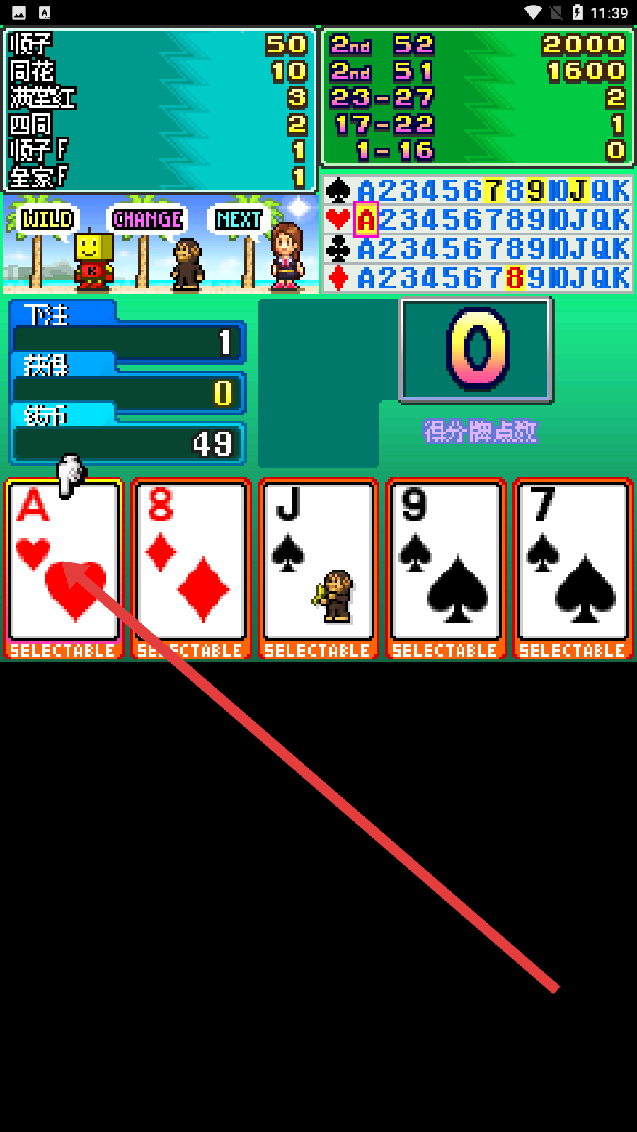 2、进入打牌界面,根据手牌与目标牌型,点击可选择SELECTABLE标记的牌,优化手牌组合,争取高分。