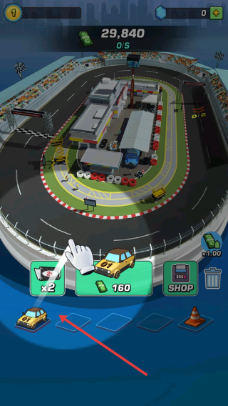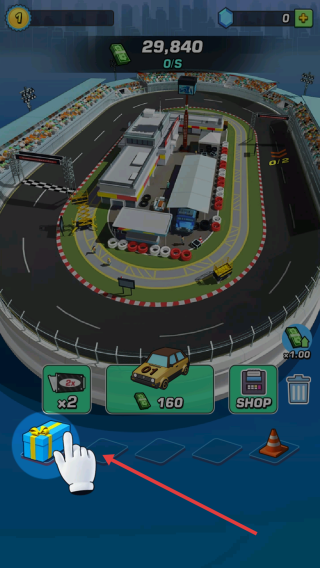 1、进入赛车场界面,上方显示资金29840,点击左侧蓝色礼盒图标,可领取奖励,助力赛车经营与比赛准备。