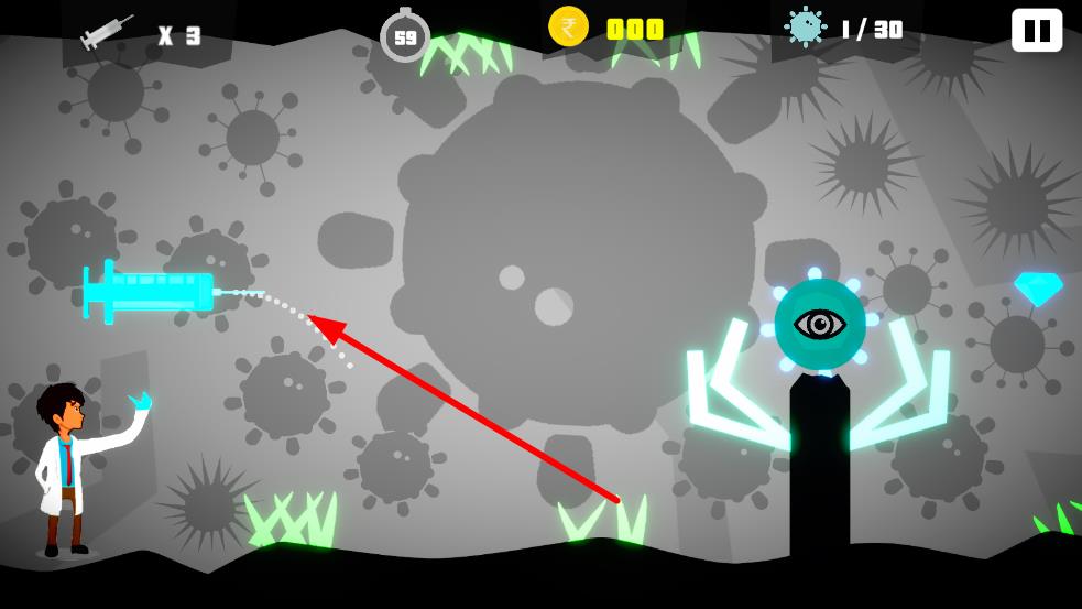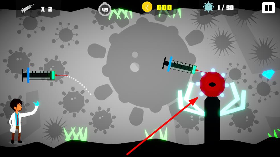1、画面左侧角色持有注射器,界面显示注射器数量、倒计时、金币数和需消灭病毒目标,点击可发射注射器攻击病毒。