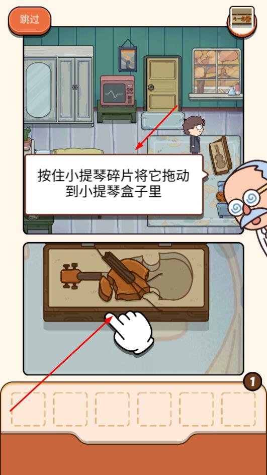 3、按住收集的小提琴碎片,拖动至小提琴盒子对应位置,完成拼接,推进游戏流程。
