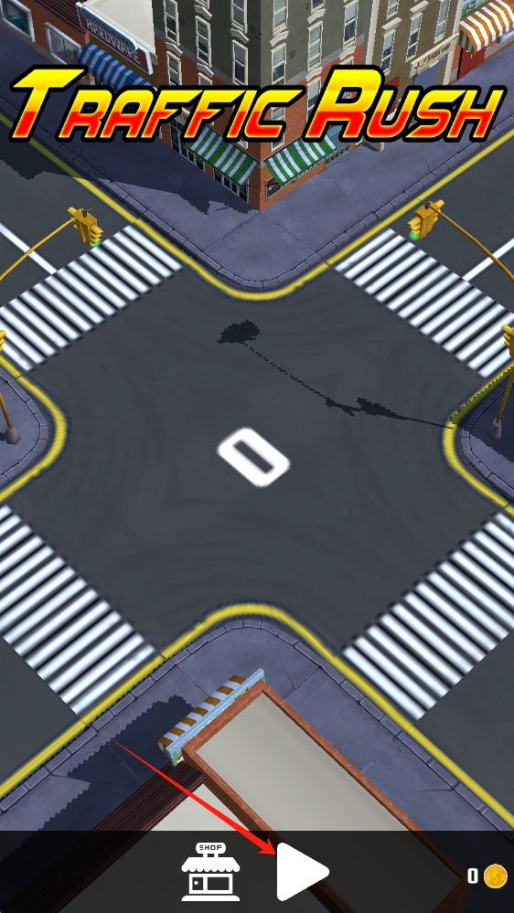 1、游戏标题界面,呈现城市路口场景,有 “SHOP”(商店 )和播放按钮,点击开始游戏。