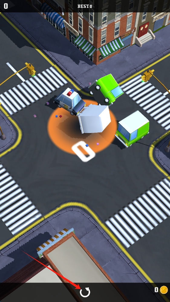 2、游戏失败画面,路口发生车辆碰撞,显示 “BESTO”(可能是成绩统计 ),底部有重玩按钮,点击重开游戏。