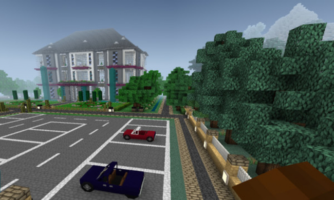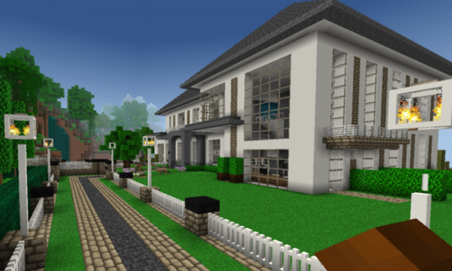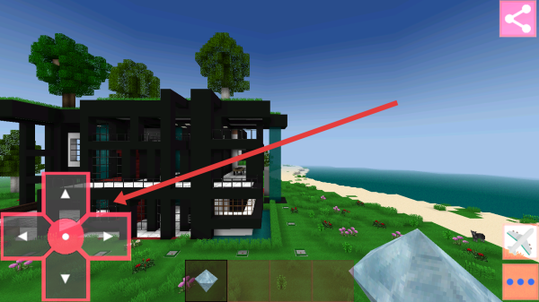 3、通过十字键移动角色,绕现代房屋行走,查看建筑细节,可尝试互动建造,或利用飞行模式切换,从空中视角规划房屋建造。