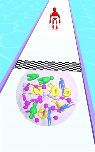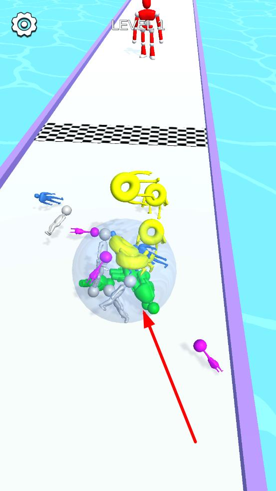 2、进入跑酷阶段,操控角色沿跑道持续前行,碰撞灰色小人,将其吸收进球体内,注意留意道路上的增益或减益标识。