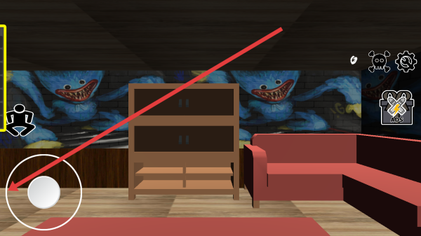 1、进入房间的场景后,操控虚拟摇杆移动,探索沙发、书架等区域,搜集物资,点击交互找隐藏物品或线索。