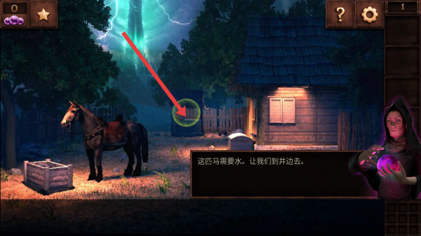 1、游戏一开局画面出现,跟随右边人物的提示,这匹马马需要水,用户点击场景中井的位置,推进任务第一步。