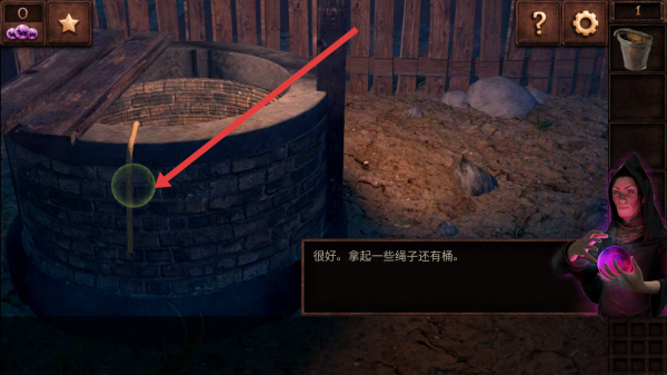 2、进入井边场景,按指引拿起绳子和桶,完成物品的收集,为打水做好准备,继续后面的任务。