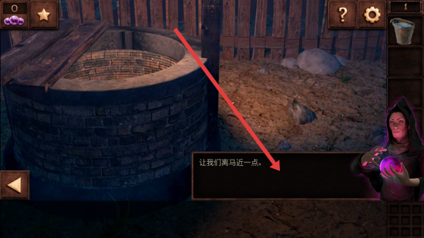 3、获取水桶和绳子后,按右边提示回到马所在的区域,靠近马匹,完成喂水等动作,推进解谜的流程。