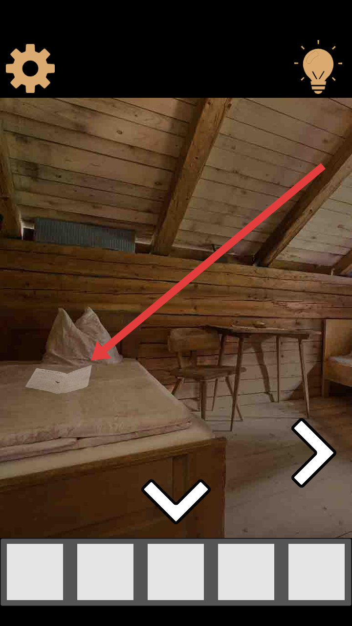 1、进入逃出记忆中的山间小屋游戏后,身处于阁楼场景,需要点击床上的纸张,获取初始解谜线索。
