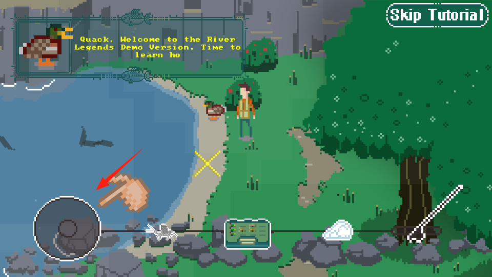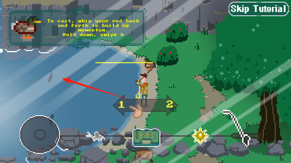 3、按住并滑动,前后甩竿蓄力,将鱼线抛入水中,开始钓鱼,熟悉发力、抛竿流程,完成教程解锁正式钓鱼玩法。
