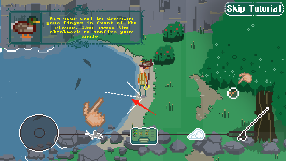 2、在水池旁边可以根据教程指示拖动手指瞄准,按提示确认角度,准备抛竿,练习瞄准水域目标。