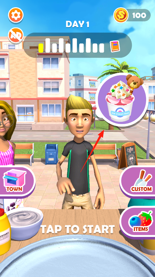 1、进入游戏界面,有顾客来袭查看顾客订单箭头指向“icecreamroll”,明确制作的要求,点击“TAPTOSTART”开始制作。