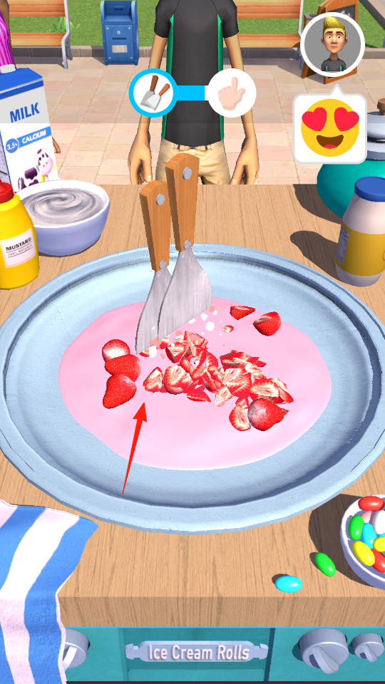 3、接着加入订单要求的配料(如草莓,箭头指向),用工具翻炒、制作,完成后交付顾客,获取金币(初始100)升级店铺。