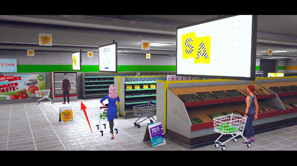 1、操控角色(如蓝衣服粉发)在超市逛,推购物车(箭头指向),到对应货架选商品,前往收银台。