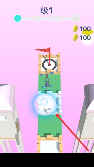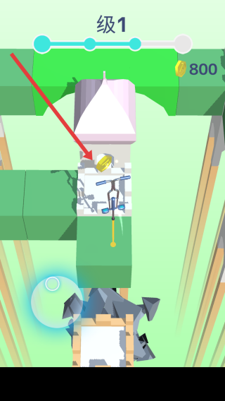 2、通过滑动轮盘引导角色沿塔层路径,突破障碍,撞击底下建筑块,获取金币,提升进度条。
