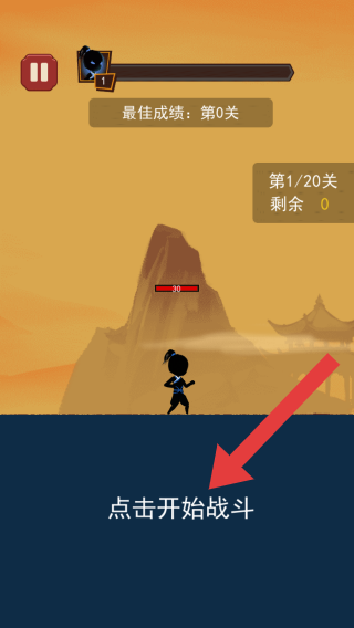 2、操作提示“点击开始战斗”,还有暂停按钮、角色及血量条等元素,呈现动作闯关游戏的战前界面状态。