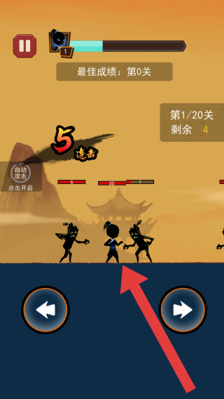 3、战斗状态:达成5连击,有“点击开启攻击”提示,左右有移动按钮,玩家需要与众多敌人进行战斗。