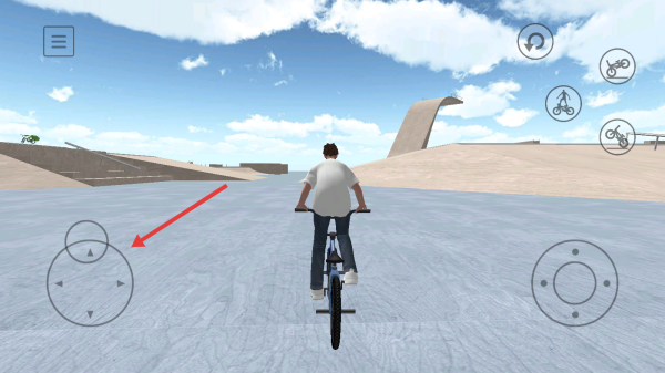 2、在赛道场景,用左侧方向轮盘,控制自行车前进方向,适应地形开始骑行。