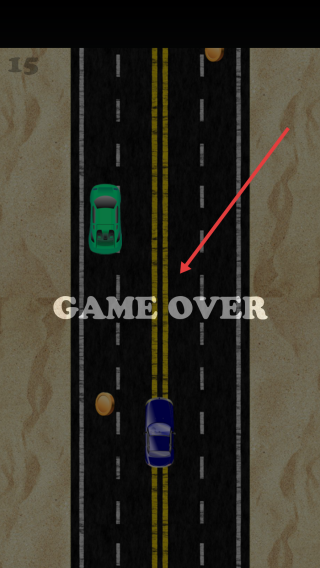 3、若赛车与其他车辆碰撞,触发【GAME OVER】,重新开始游戏,争取更远行驶距离。