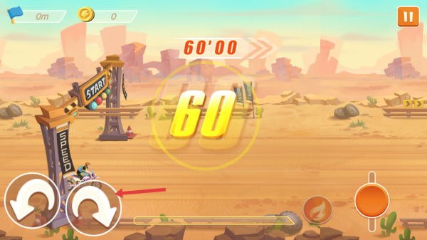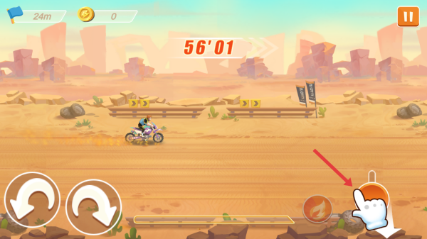 2、在沙漠赛道,用左侧转向按键控摩托平衡、方向,右侧按键控制加速、特技动作。
