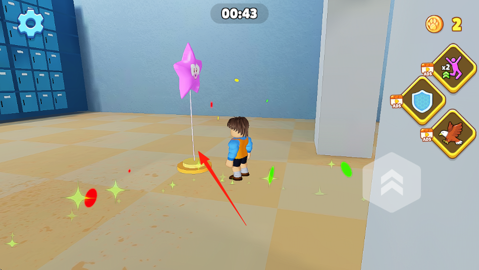 1、靠近粉色星星装置(箭头指向),触发收集或任务,获取奖励(如右侧金币“2”)。