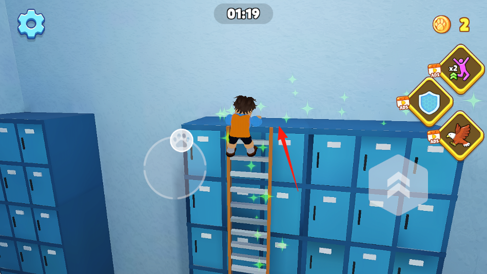 2、借助梯子爬上储物柜顶,按箭头方向移动,探索高处隐藏道具、通道。