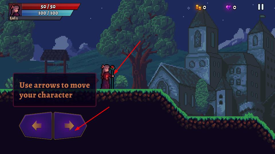 1、进入游戏界面,依据提示“Use arrows to move your character”,通过左右箭头按键操控角色移动,开启冒险。