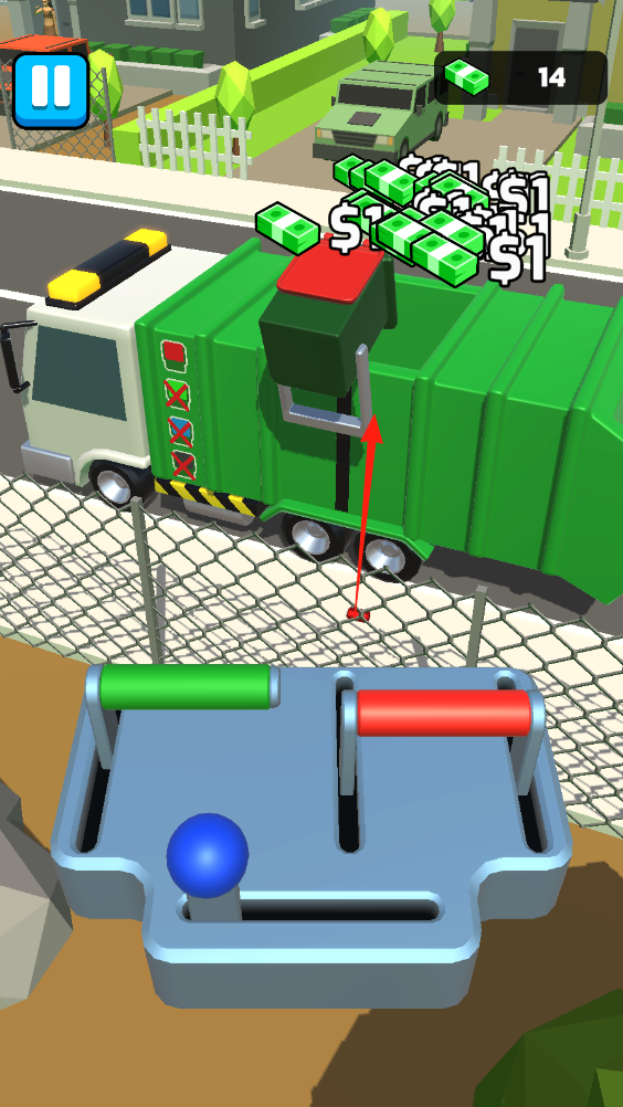 3、成功倒垃圾后,获得金币(如14),可用于升级设备、解锁新区域,继续回收任务。