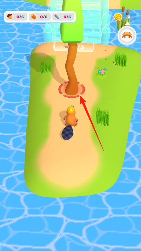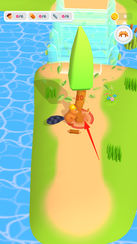 1、操控海狸,到树木处,持续互动砍树,获取木材,收集坚果、矿石等资源(顶部显示数量)。