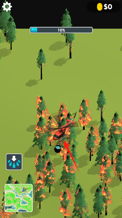 2、点击左侧水滴按钮(箭头指向),到水源地取水,再飞到着火点上方,投放水灭火。