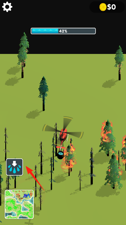3、关注进度条(如10%、42%),重复取水、灭火流程,扑灭所有火情,完成关卡,积累金币升级直升机。